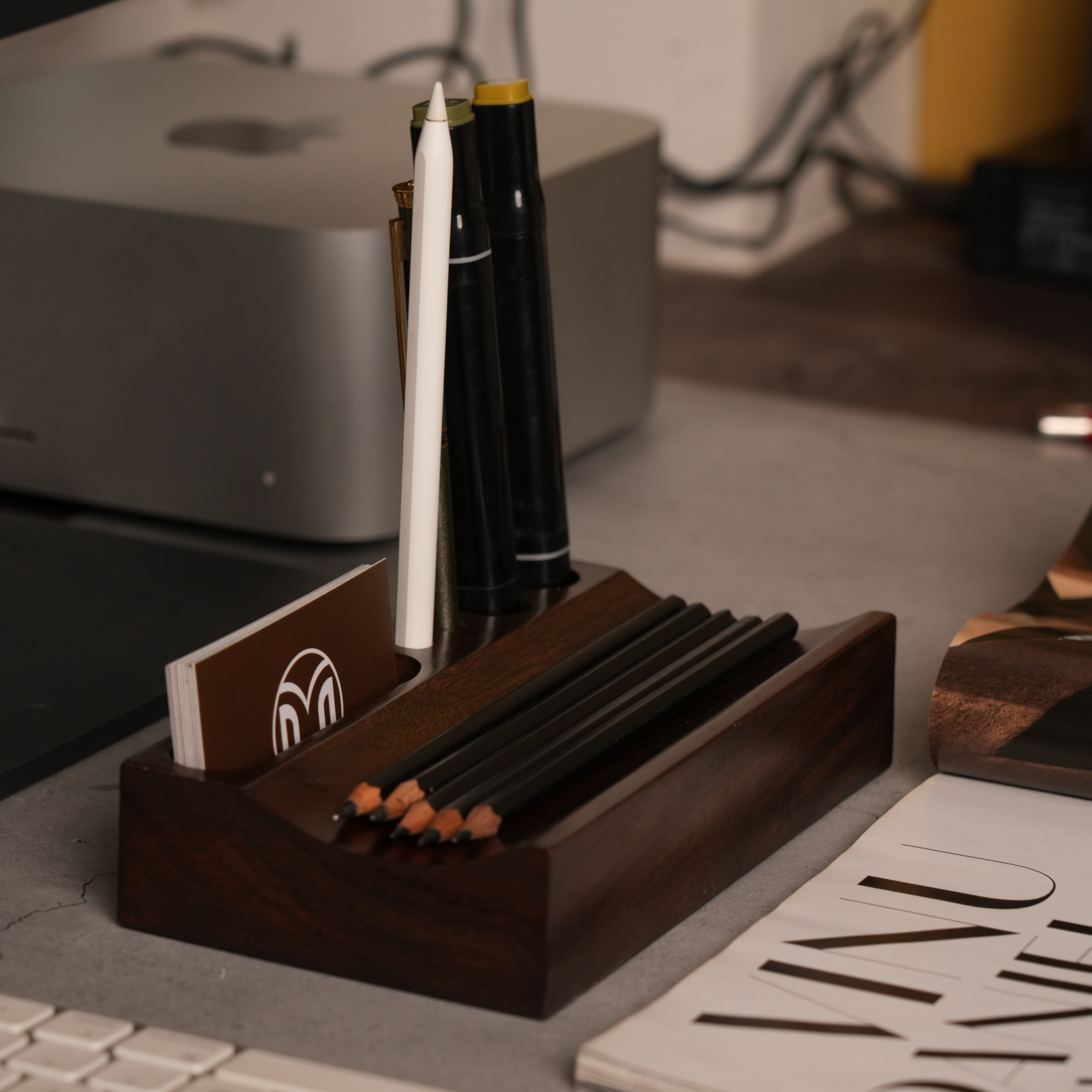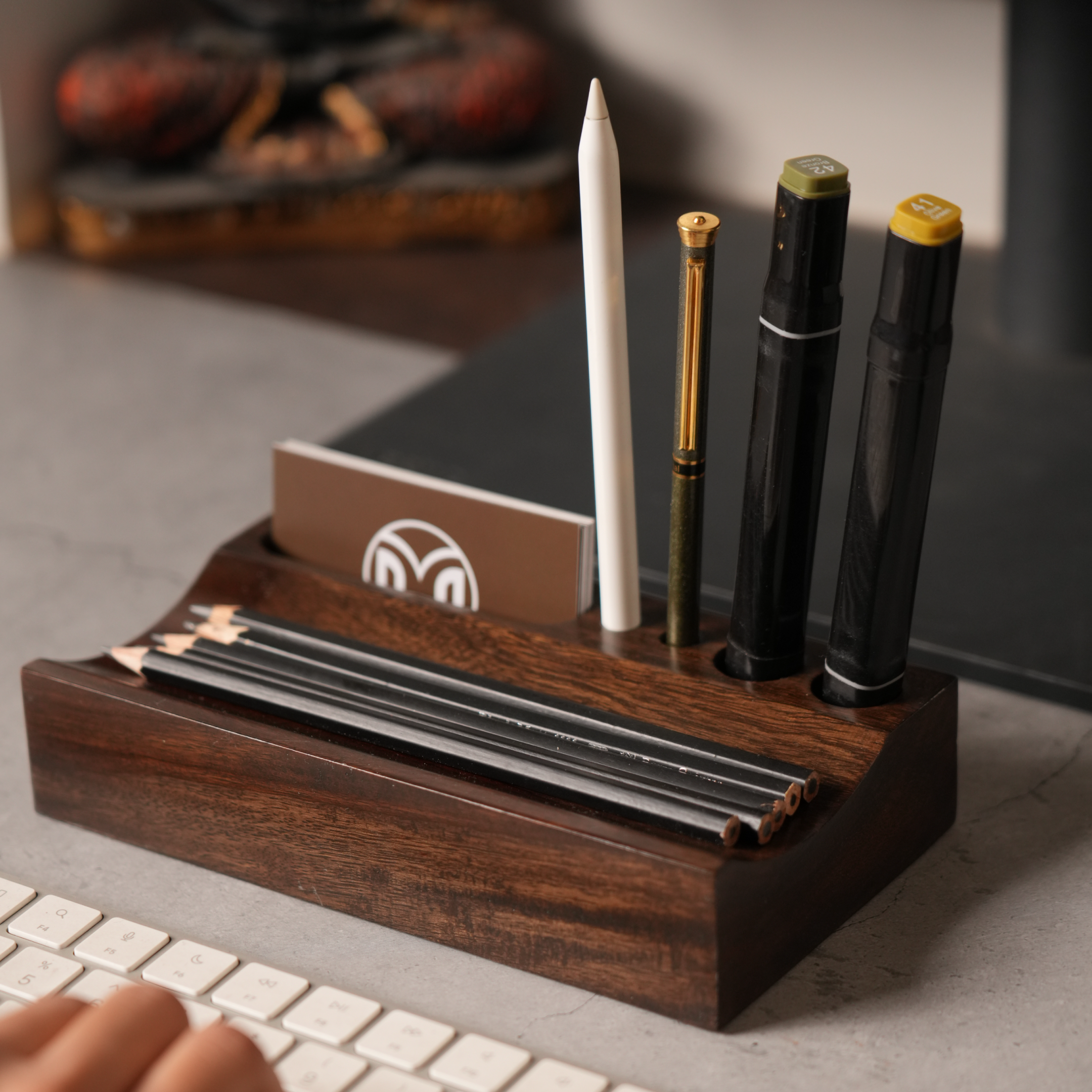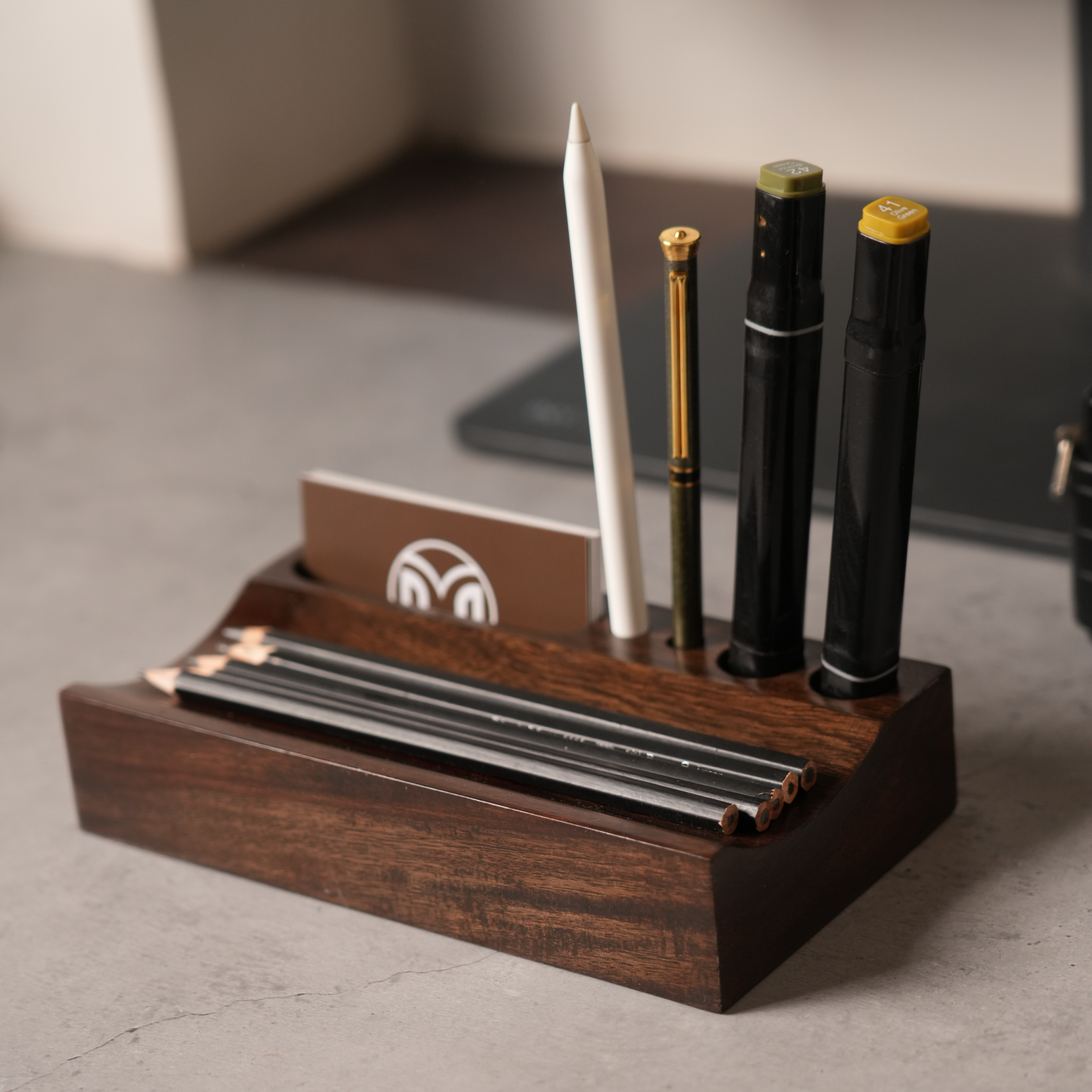 Handcrafted from rich Shisham wood organizer with slots for pens, pencils, cards, and your phone,
